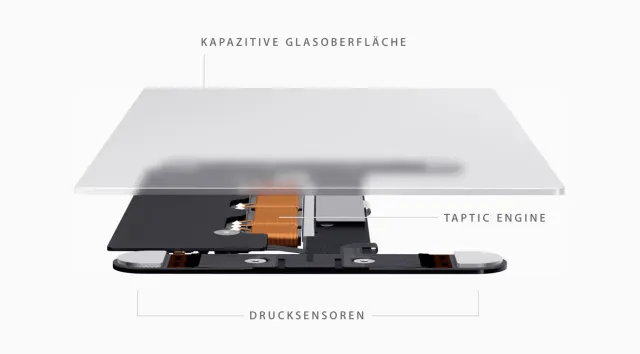 So nennt Apple das neue Trackpad. Zuerst spürt man bei der Bedienung keinen Unterschied. Auffällig ist einzig, dass ein Klick butterzart und mit einem perfekten Widerstand ausgeführt wird, begleitet vom typischen Geräusch. Der Kraftaufwand ist minimal und deutlich geringer als bei den anderen MacBooks. Allerdings ist er gerade noch hoch genug, um Fehleingaben zu vermeiden. Perfekt. Und hier kommt die Pointe: Es gibt keinen Klick. Wenn das MacBook ausgeschaltet ist, gibt die Oberfläche des Trackpads kein bisschen nach. Stattdessen wird der vermeintliche Klick von der «Taptic Engine» mit Elektromagneten simuliert. Oder anders gesagt: Nicht Sie drücken das Trackpad, sondern das Trackpad drückt Sie!