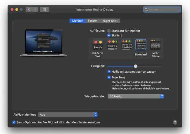 Die beiden externen Displays arbeiten in der vollen Auflösung und mit 60 Hz – zusätzlich zum eingebauten Display des MacBook Pro.