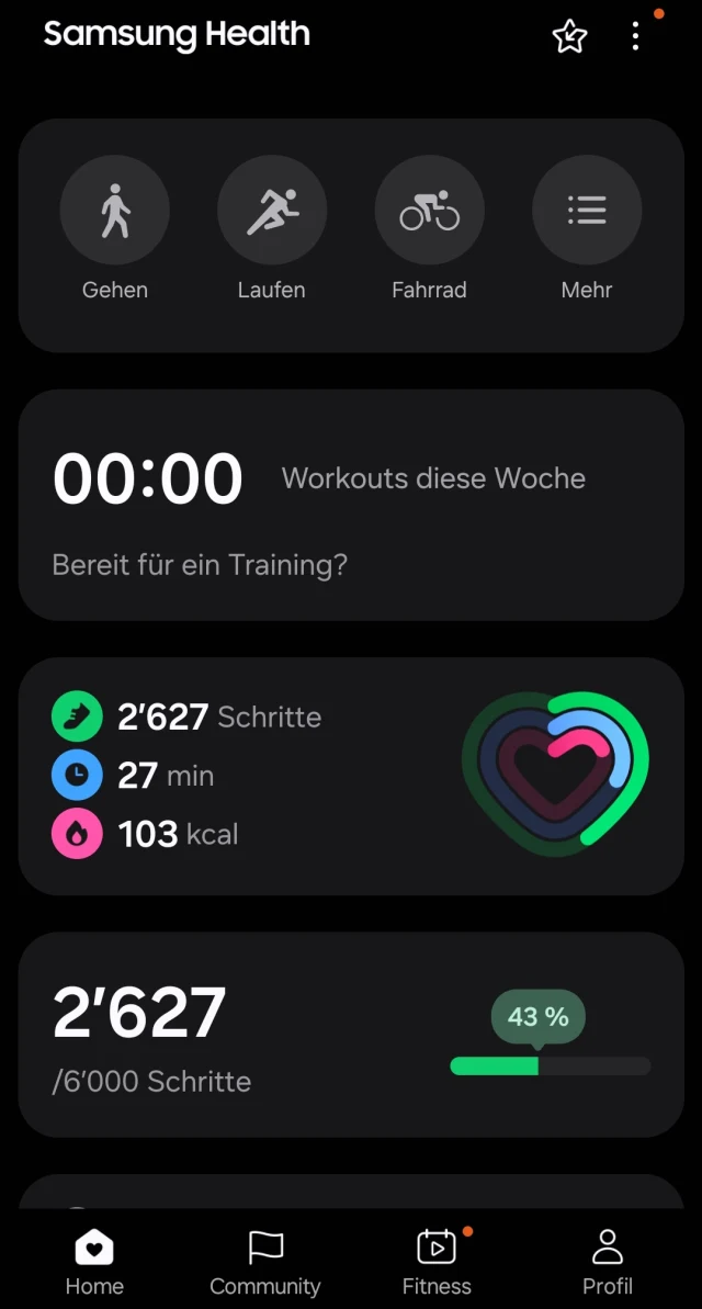 Ein weiteres Minitool, das Samsung in dem Zusammenhang anbietet, ist die Heath-App. Hier lassen sich gezielt sportliche respektive Freizeitaktivitäten (Wandern, Velo, Laufrad, Zirkel- und Krafttraining usw.) auswählen und damit seine Körperfitness trainieren. Eine Besonderheit des Rings, nämlich die Gestensteuerung, findet sich unterhalb der Buttons in der App. Im Zusammenspiel mit einem Samsung-Handy kann der Ring durch zweimaliges Antippen von Zeigefinger und Daumen ein Foto respektive Video aufnehmen. Ausserdem kann per Geste auch ein (Weck-)Alarm deaktiviert werden, was durchaus am Morgen seine gewisse «Berechtigung» hat. Top: Voll aufgeladen konnte der Ring gut 6 Tage getragen werden. MIt dem Ring an der Kasse zu bezahlen, ist leider nicht möglich. Dem Wearable-Ring fehlt schlicht und einfach der NFC-Chip. Und: Natürlich lässt sich der Ring auch mit anderen Android-Smartphones benutzen. Allerdings können dann nicht alle möglichen Funktionen des Rings ausgeschöpft werden.
