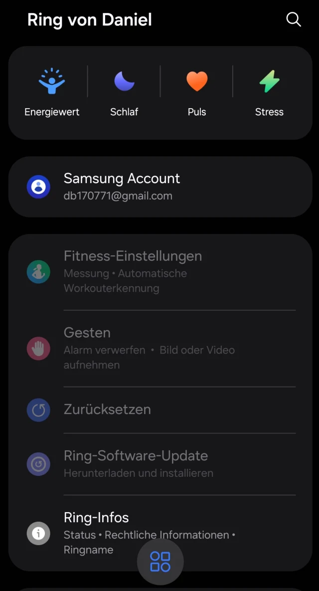 Im Anschluss wird Samsungs Wearable-App nachgeladen, so etwas wie der Dreh- und Angelpunkt für den Ring. Beim Einrichtungsprozess, der Schritt für Schritt abläuft, muss der Anwender ein Samsung-Konto erstellen. Danach hat er allerdings auch schon Zugriff auf die wichtigsten Funktionen des Minitools. Die App zieht dazu in Sekundenintervallen die Messdaten, die die Sensoren des Rings (auf seiner Innenseite) übermittelt. Konkret: Die App bietet im Startmenü die Buttons Energiewert, Schlaf, Puls und Stress. Dahinter verbergen sich verschiedene Messmöglichkeiten, die allesamt den Fitness- und Gesundheitszustand des Anwenders überprüfen. Wie bereits erwähnt gehören dazu die Herzfrequenz- und Pulsmessung, wobei der Ring kontinuierlich die Herzfrequenz überwacht und Warnungen ausgibt, wenn unregelmässige Werte festgestellt werden. Das Schlaftracking hingegen analysiert die Schlafqualität, um Rückschlüsse auf den Gesundheitszustand zu ziehen. Und drittens: Das Aktivitätstracking zählt Schritte, zurückgelegte Distanzen und verbrannte Kalorien, die allesamt aufgezeichnet werden, um den eigenen (fortlaufenden) Fitnesszustand zu kategorisieren. Im Test konnten wir damit den Puls und auch Schlafrhythmus messen. Beides funktionierte zuverlässig.