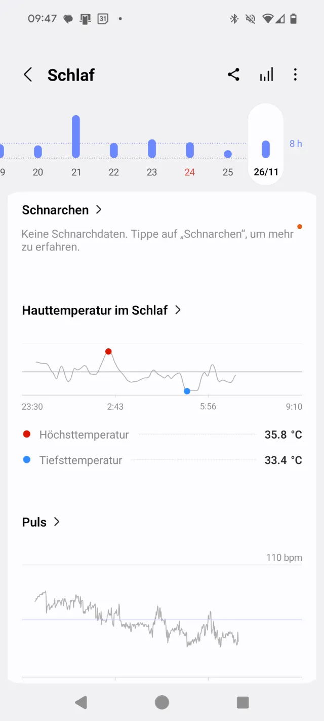 Wer gerne seinen Schlaf überwacht: Die Smartwatch bietet einen neuen KI-Algorithmus für die Schlafanalyse. War der Vorgänger für die Autorin eher zu optimistisch, ist die Schlafaufzeichnung im Test nun genauer. Wer 7 Tage hintereinander den Schlaf überwacht, erhält ein Schlaf-Coaching. Nebst den bekannten Schlafphasen überwacht die Uhr Schnarchdaten, den Blutsauerstoff während des Schlafs sowie die Hauttemperatur und den Puls in der Nacht.