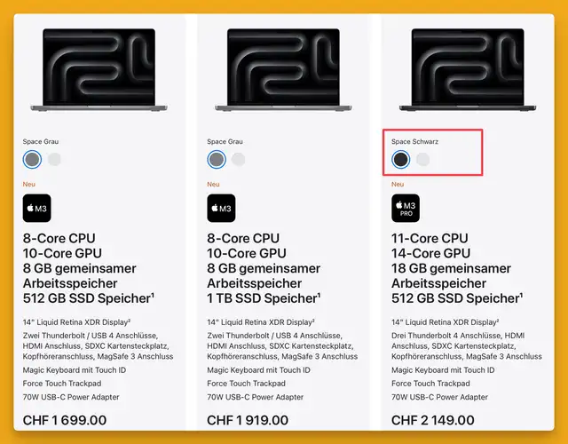 Doch diese Farbe gibt es nicht umsonst – oder zumindest nicht bei jedem Gerät. Fast wie eine Stichelei wirkt der Umstand, dass beim 14 Zoll grossen MacBook Pro die Ausführung «Space Schwarz» nur beim stärksten Modell mit dem M3 «Pro» angeboten wird.