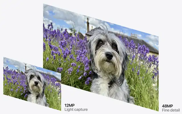 Bei der Kamera-Hardware spielen sich viele Verbesserungen hinter den Kulissen ab. So wird der neue Fusion-Sensor doppelt so schnell ausgelesen, wie beim Vorgänger. Das ist vor allem bei RAW-Aufnahmen spürbar. Ausserdem preist Apple den «Zero shutter lag»: Beim Drücken des Auslösers wird die Aufnahme ohne jede Verzögerung ausgelöst und aufgezeichnet, auch wenn mit 48 Mpx in ProRAW oder HEIF fotografiert wird.Fusion-Kamera. Die Bezeichnung steht für die Hauptkamera des iPhone 16 mit 48 Mpx – und für die wichtigste Kamera überhaupt. Der Markteing-Begriff «Fusion» bezieht sich darauf, dass zwei Fotos in verschiedenen Auflösungen gleichzeitig aufgenommen und anschliessend zu einem besseren Bild kombiniert werden: eine 48-Mpx-Aufnahme mit maximalen Details und eine 12-Mpx-Aufnahme mit maximalen Belichtungsinformationen. Daraus resultiert ein Foto mit 24 Mpx, das die besten Informationen in sich vereint.