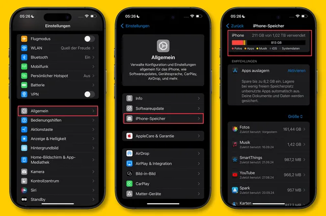 Doch wer braucht so viel Speicher? Wer hat so viel Geld? Die zuverlässigste Antwort liefert das alte iPhone. Öffnen Sie die Einstellung Allgemein (hier unter iOS 18) und tippen Sie auf den Bereich iPhone-Speicher. Nun sehen Sie, was bis anhin benötigt wurde. Wenn der Speicher eher knapp ist, sollten Sie mindestens eine Stufe höher gehen. Wenn also 200 GB von 256 GB belegt sind, ist ein iPhone mit 512 GB angezeigt.
