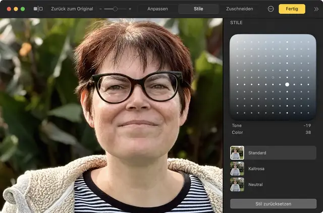 Palette. Beeinflusst die allgemeine Farbgebung und den Stil des Fotos. Der Schieberegler steht beim Stil «Standard» nicht zur Verfügung. Die Palette ändert vor allem die Hauttöne, ohne dass die Charakteristik im Allgmeinen in Mitleidenschaft gezogen wird.